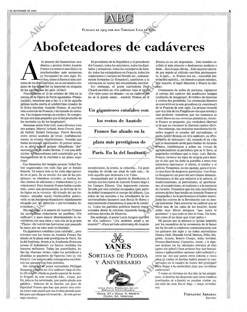 Sin embargo, tan unánime manifestación fúnebre inspiró al creador del surrealismo, el poeta André Bretón, en «Un cadáver», su «Prohibición de inhumar»: «Si, estando él en vida era ya demasiado tarde para hablar de Anatole France, limitémonos a echar un vistazo de agradecimiento al periódico que se lo lleva, al papelucho cotidiano que lo trajo. Loti, Barres, France, tiremos los tejos de alegría para festejar el año que ha dado la puntilla a estos tres siniestros tiparracos: el idiota, el traidor y el policía. Tengamos, no me opongo, para el tercero, no me opongo, una frase de desprecio particular. Con France desaparece un poco del servilismo humano. Festejemos el día que entierra a la astucia, al tradicionalismo, al patriotismo, al oportunismo, al escepticismo, al realismo y a la ausencia de corazón. Pensemos que los más morcilleros actores de hoy han tenido en Anatole France al compinche y no le perdonemos el haber mancillado los colores de la Revolución con su inercia sonriente. Para encerrar su cadáver que se vacíe una de las cajas de los muelles donde están esos libros antiguos «que tanto le gustaban» y que todo se tire al Sena. Un hombre como él no tiene que criar polvo».