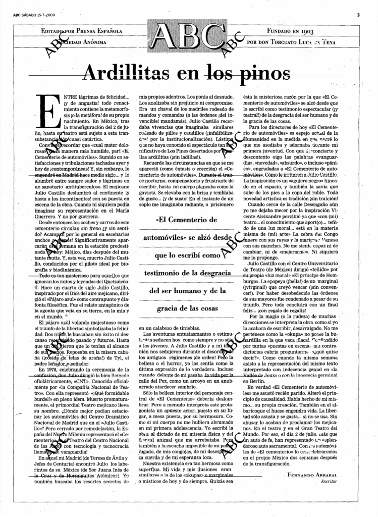 Conviene recordar que cual «mater dolorosa» de la manera más humilde, parí «El Cementerio de automóviles». Sumido en satisfacciones y tribulaciones tachadas ayer y hoy de ¡contemporáneas! Y, sin embargo, lo engendré en Madrid hace medio siglo… y lo alumbré entre sangre sudor y lágrimas en un sanatorio antituberculoso. El mejicano Julio Castillo deslumbró al continente ¡y hasta a los incontinentes! con su puesta en escena de la obra. Cuando ni siquiera podía imaginar su representación en el María Guerrero. Y no por guerrera.