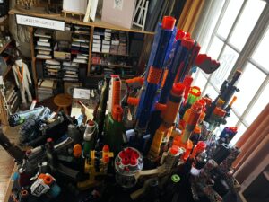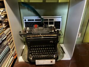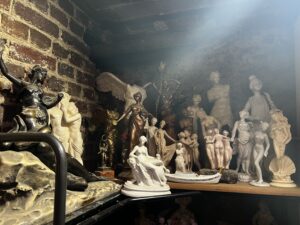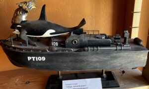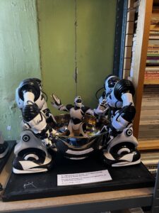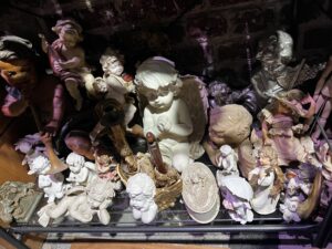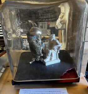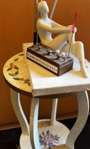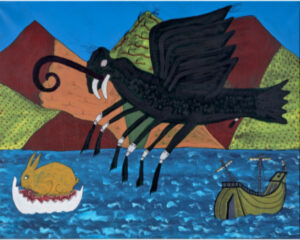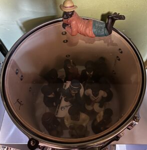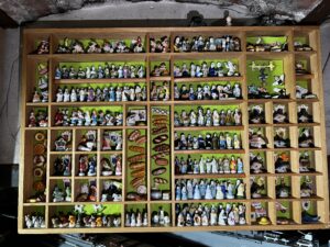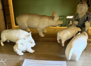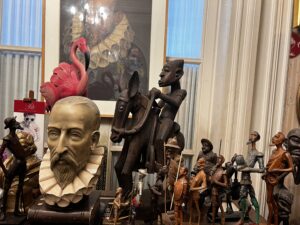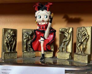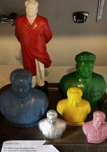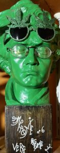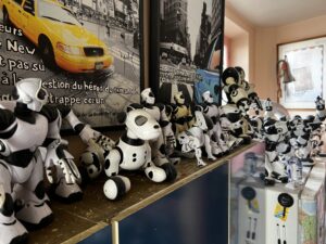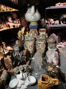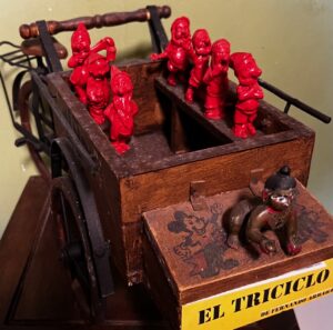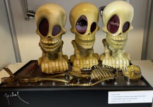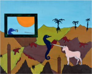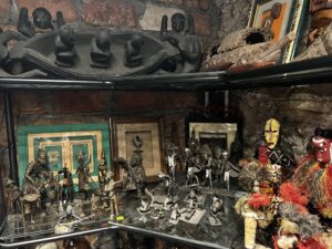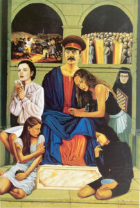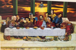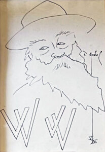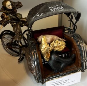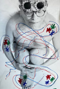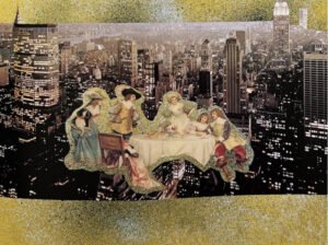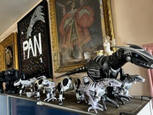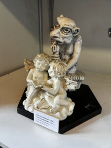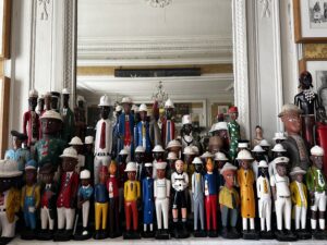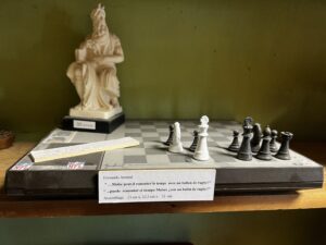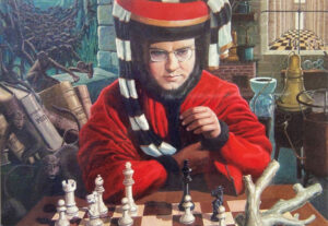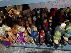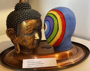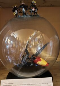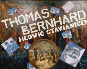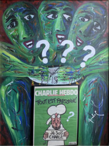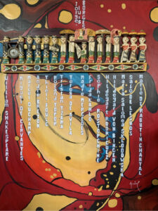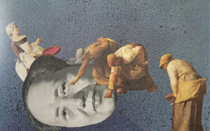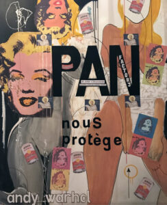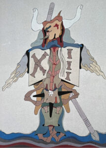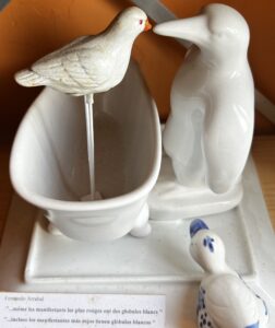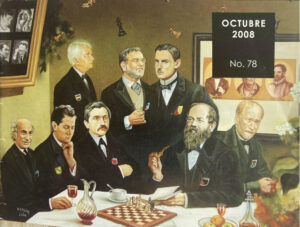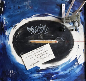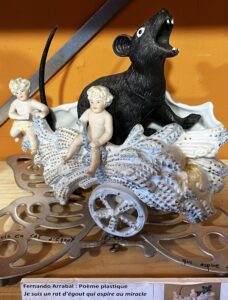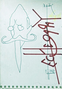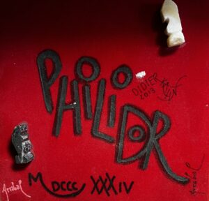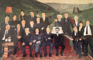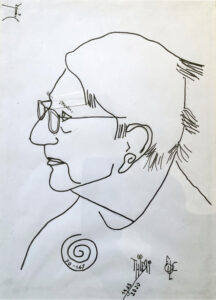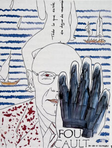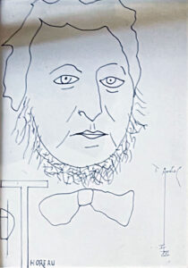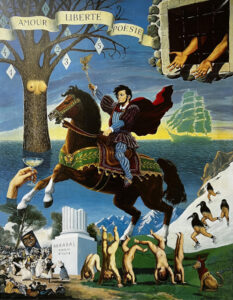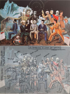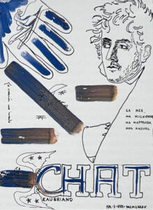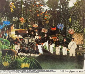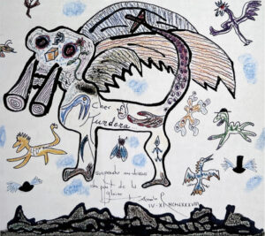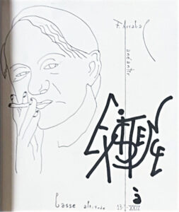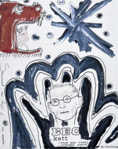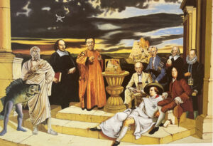 de G à D: J. Prévert, J. Dubuffet, A. Onna, M. Duchamp, G. Charif, M. Leiris, M. Ernst, R. Queneau, J. Miro, A. Jarry, R. Clair, B. Vian, E. Ionesco, M. Ray, J. Baudrillard, F. Arrabal, D. Fo, T. Foulc, Crocodile, L. moreau, U. Eco