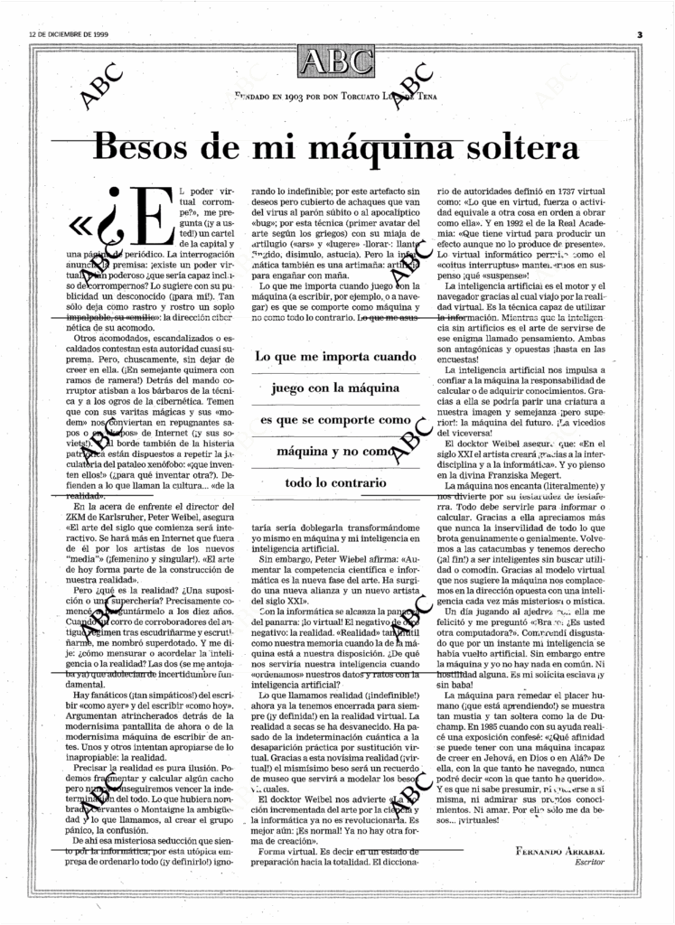 La máquina para remedar el placer humano (¡que está aprendiendo!) se muestra tan mustia y tan soltera como la de Duchamp. En 1985 cuando con su ayuda realicé una exposición confesé: «¿Qué afinidad se puede tener con una máquina incapaz de creer en Jehová, en Dios o en Alá?». De ella, con la que tanto he navegado, nunca podré decir «con la que tanto he querido». Y es que ni sabe presumir, ni quererse a sí misma, ni admirar sus propios conocimientos. Ni amar. Por ello sólo me da besos… ¡virtuales!