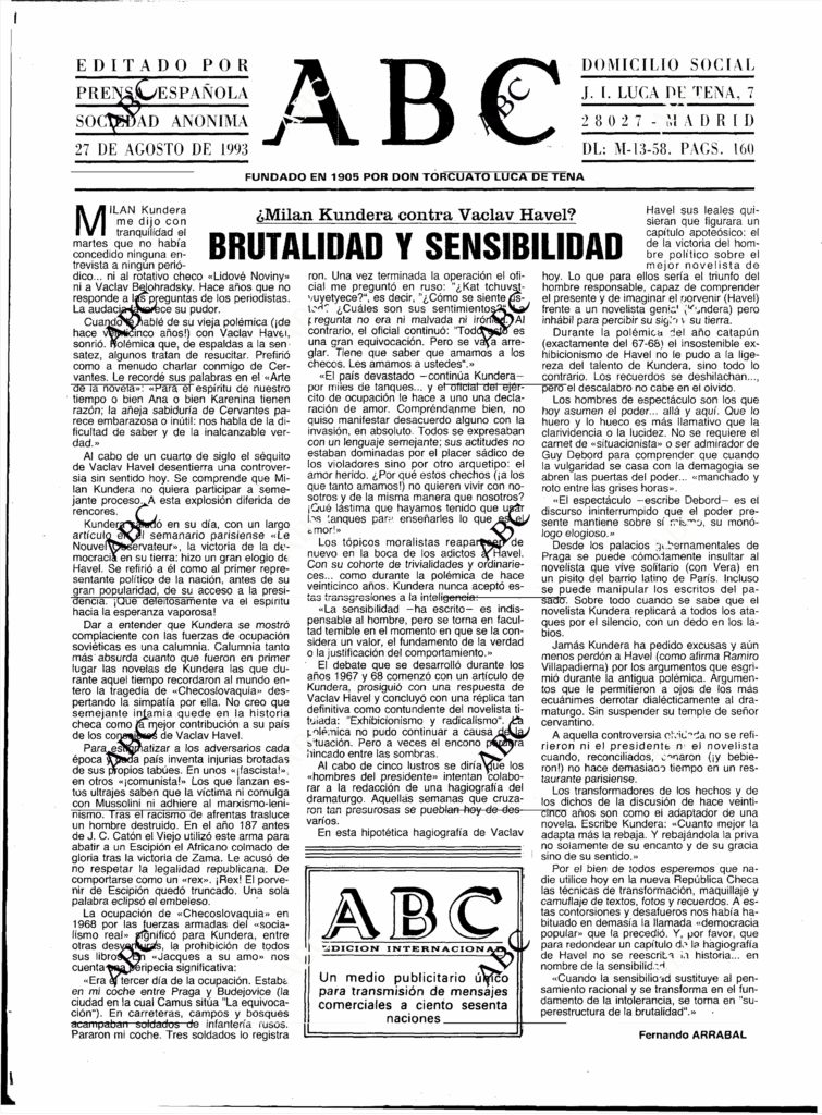 Dar a entender que Kundera se mostró complaciente con las fuerzas de ocupación soviéticas es una calumnia. Calumnia tanto más absurda cuanto que fueron en primer lugar las novelas de Kundera las que durante aquel tiempo recordaron al mundo entero la tragedia de «Checoslovaquia» despertando la simpatía por ella. No creo que semejante infamia quede en la historia checa como la mejor contribución a su país de los consejeros de Vaclav Havel.