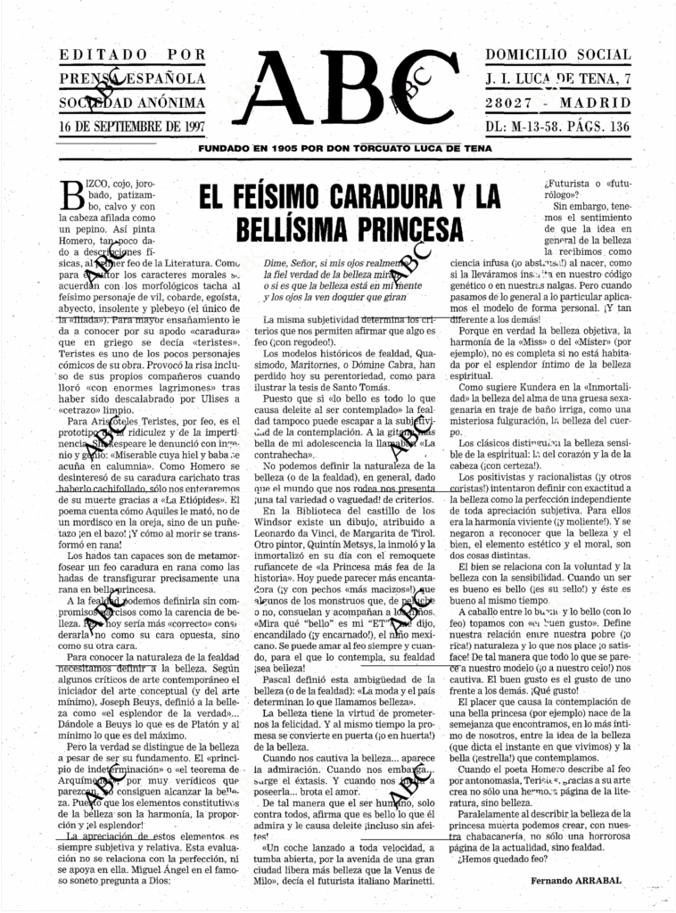 Paralelamente al describir la belleza de la princesa muerta podemos crear, con nuestra chabacanería, no sólo una horrorosa página de actualidad, sino fealdad.