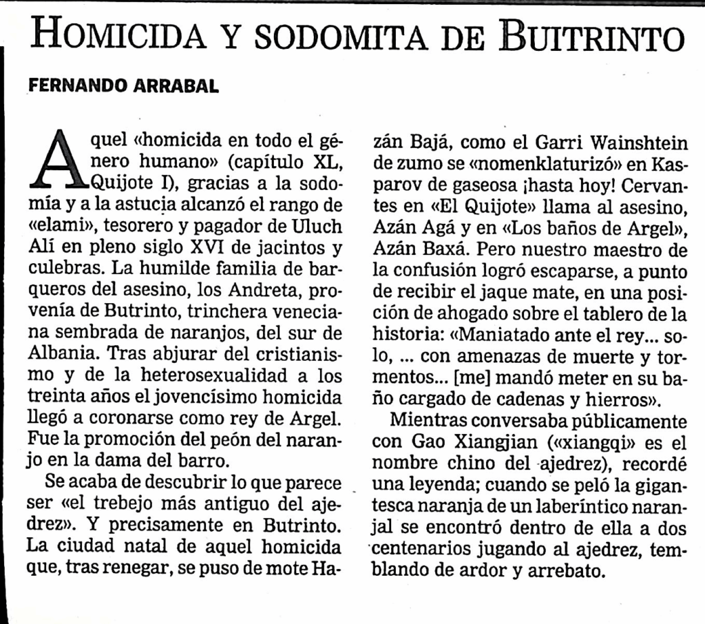 Se acaba de descubrir lo que parece ser «el trebejo más antiguo del ajedrez». Y precisamente en Butrinto. La ciudad natal de aquel homicida que, tras renegar, se puso de mote Hazán Bajá, como el Garrí Wainshtein de zumo se «nomenklaturizó» en Kasparov de gaseosa ¡hasta hoy! Cervantes en «El Quijote» llama al asesino, Azán Agá y en «Los baños de Argel», Azán Baxá. Pero nuestro maestro de la confusión logró escaparse, a punto de recibir el jaque mate, en una posición de ahogado sobre el tablero de la historia: «Maniatado ante el rey… solo, … con amenazas de muerte y tormentos… [me] mandó meter en su baño cargado de cadenas y hierros».