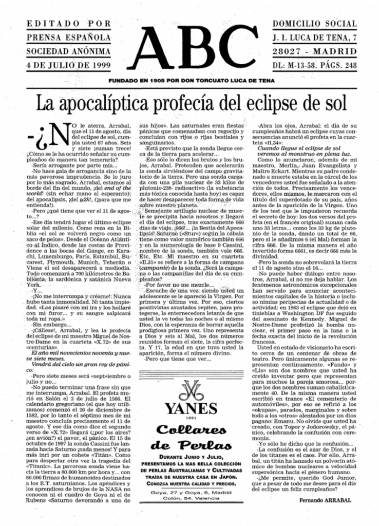 -Abra los ojos. Arrabal: el día de su cumpleaños habrá un eclipse cuyas consecuencias anunció él profeta en la cuarteta «II.34».