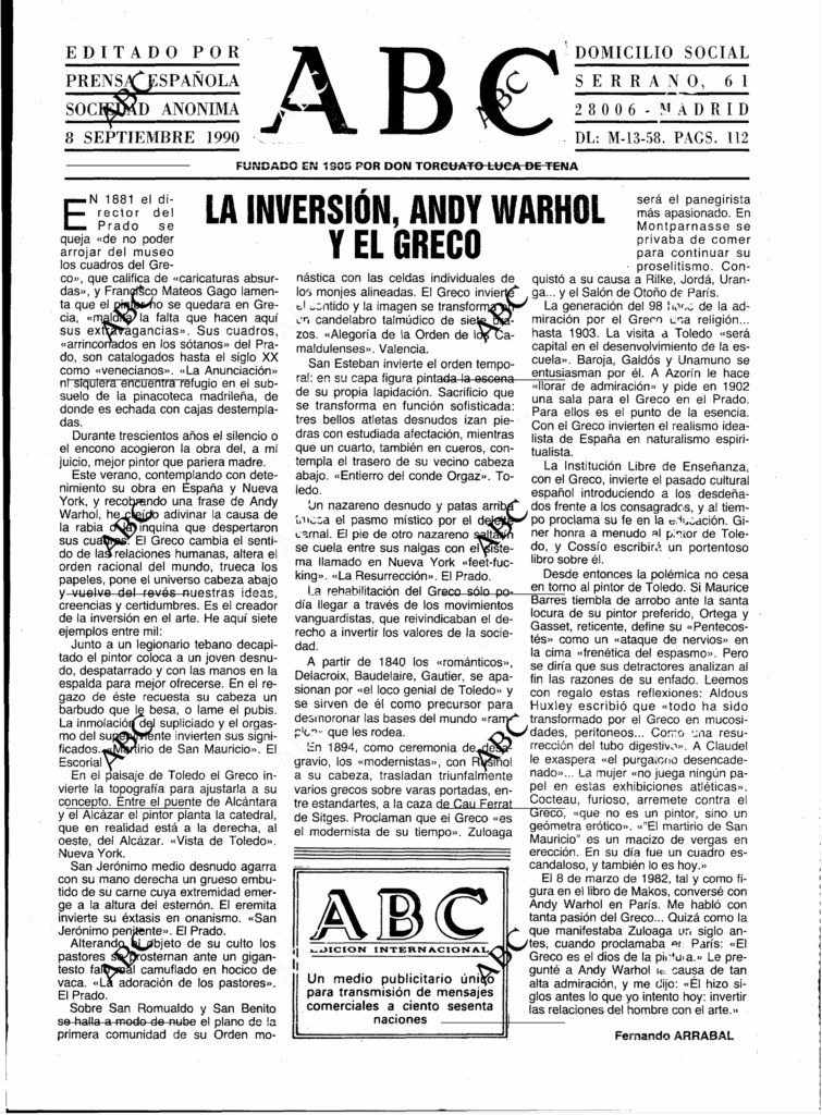 El 8 de marzo de 1982, tal y como figura en el libro de Makos, conversé con Andy Warhol en París. Me habló con tanta pasión del Greco… Quizá como la que manifestaba Zuloaga un siglo antes, cuando proclamaba en París: «El Greco es el dios de la pintura». Le pregunté a Andy Warhol la causa de tan alta admiración, y me dijo: «Él hizo siglos antes lo que yo intento hoy: invertir las relaciones del hombre con el arte».