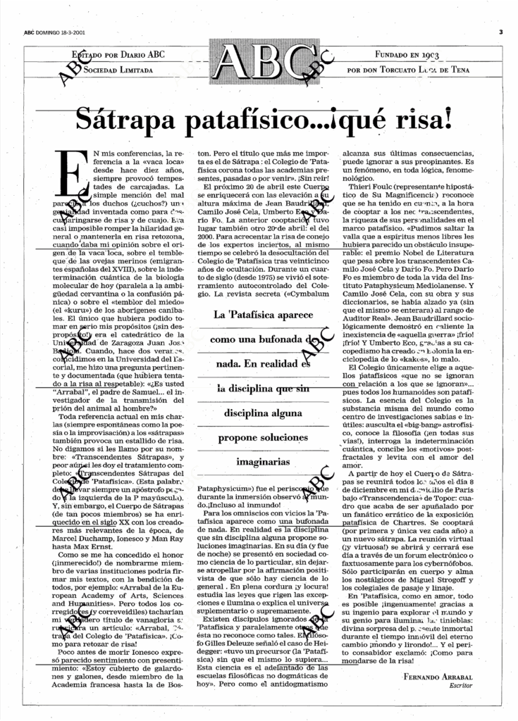 Como se me ha concedido el honor ¡inmerecido! de nombrarme miembro de varias instituciones podría firmar mis textos, con la bendición de todos, por ejemplo: «Arrabal de la European Academy of Arts, Sciences and Humanities». Pero todos los corregidores (y correveidiles) tacharían mi verdadero título de vanagloria si rubricara un artículo: «Arrabal, Sátrapa del Colegio de ‘Patafísica». ¡Como para retozar de risa!