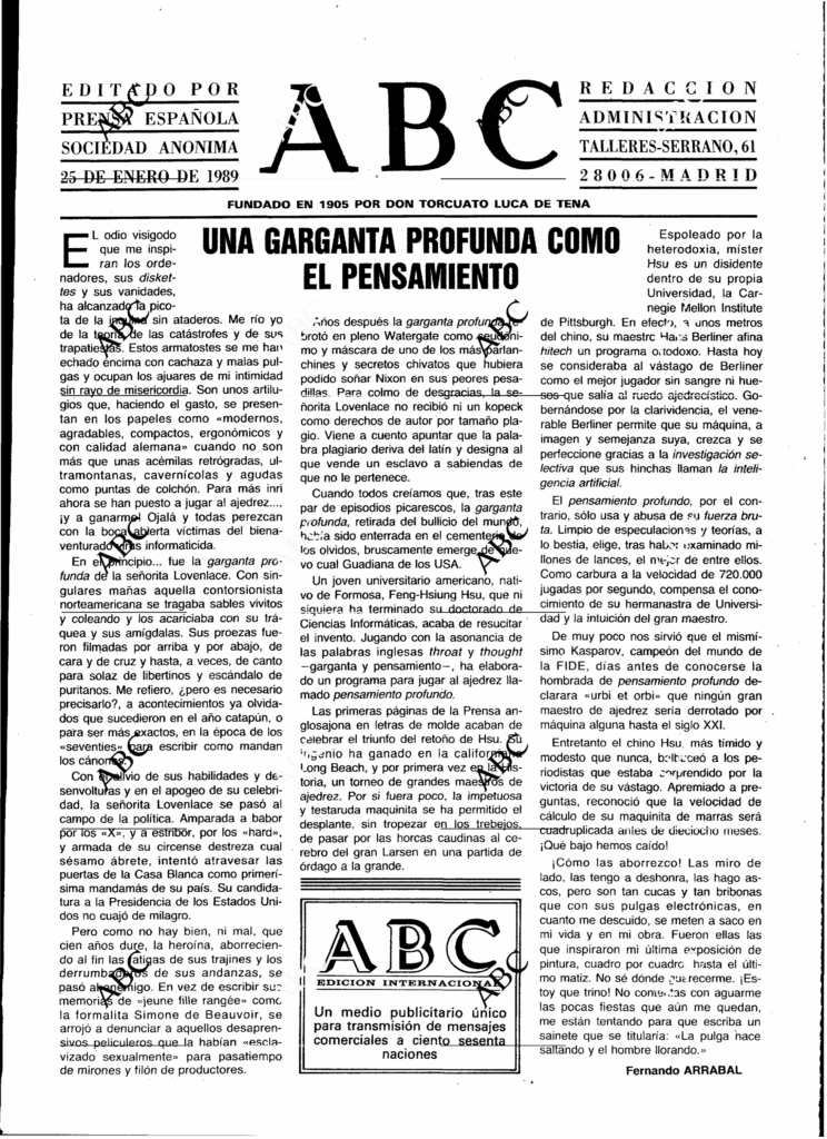 Un joven universitario americano, nativo de Formosa, Feng-Hsiung Hsu, que ni siquiera ha terminado su doctorado de Ciencias Informáticas, acaba de resucitar el invento. Jugando con la asonancia de las palabras inglesas throat y thought —garganta y pensamiento—, ha elaborado un programa para jugar al ajedrez llamado pensamiento profundo.